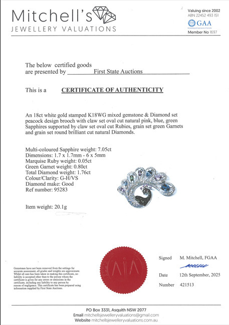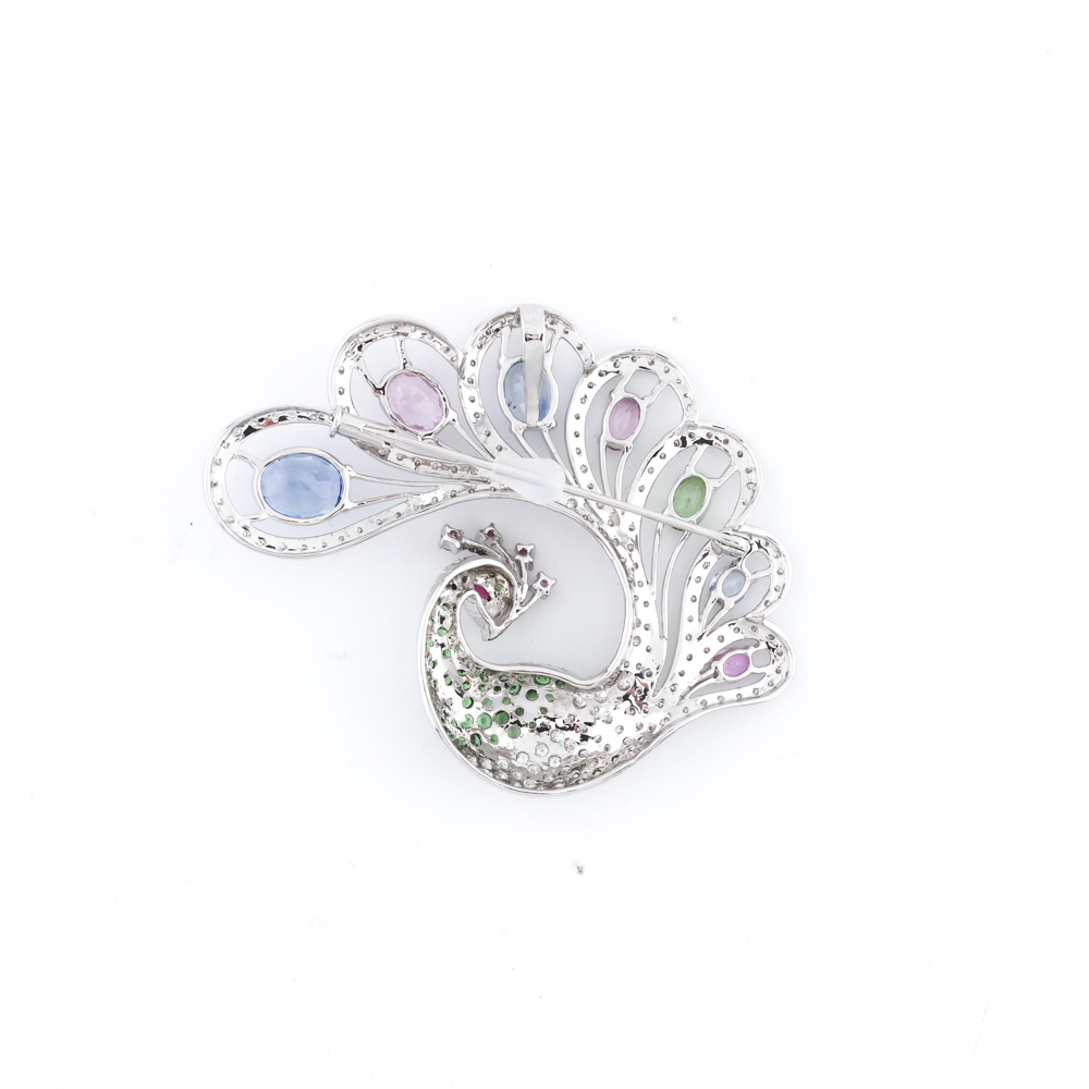 Lot 277Sapphire, Garnet & Diamond Peacock Brooch