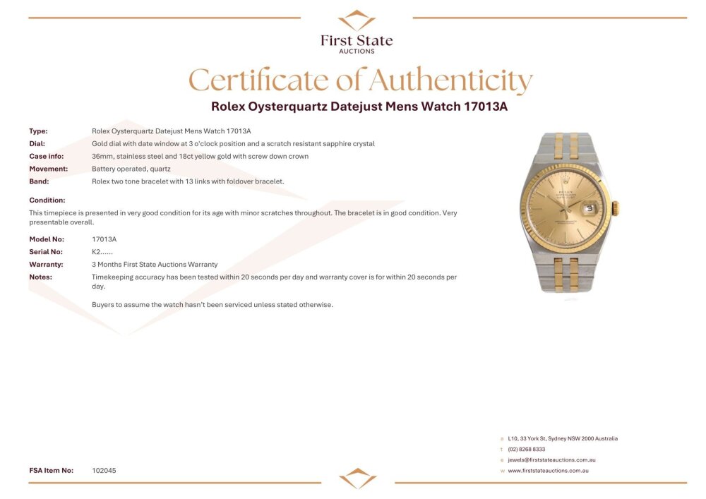 Lot 106Rolex Oysterquartz Datejust Mens Watch 17013A