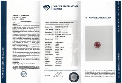 A loose round brilliant cut Natural Argyle Origin Pink Diamond of 0.054ct (With GSL Report graded as Natural Fancy Vivid Purplish Pink SI2 #AA70946/1. Origin: Argyle deposit, Western Australian.
