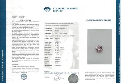 A loose round natural Argyle Origin pink Diamond of 0.072ct (With GSL Report graded as Natural Fancy Light Pink P2 #AA69341/2. Origin: Argyle deposit, Western Australia). (As New)