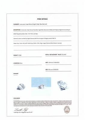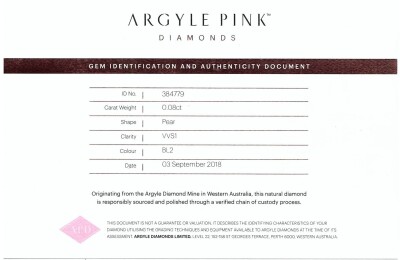 A loose pear shape Natural Argyle Blue Diamond of 0.08ct (with Argyle Pink Diamonds Report #384779 graded as Blue Violet - BL2 VVS1). With Valuation Certificate dated 19/08/25. (As New)