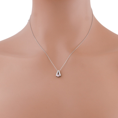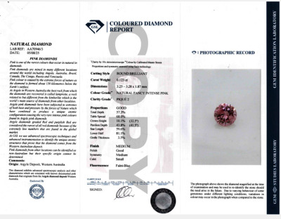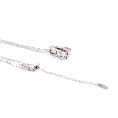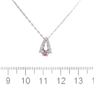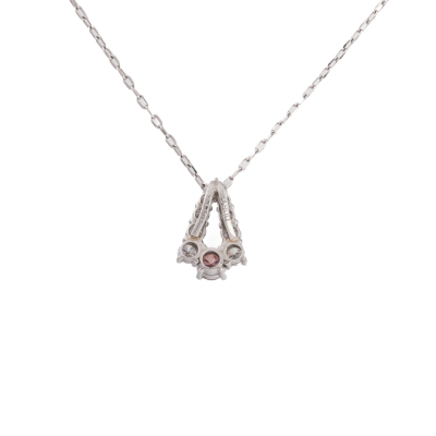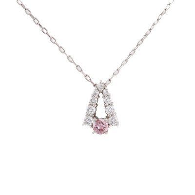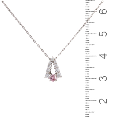 Diamond pendant with centre round Natural Pink Diamond of 0.12ct (with copy of GSL memo graded Natural Fancy Intense Pink P2 #AA70946/3) and round Natural Diamonds totalling 0.23ct. Platinum - 900 with 44.5cm Platinum - 850 adjustable chain. Weight: 3.2g. (Pre-owned)