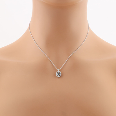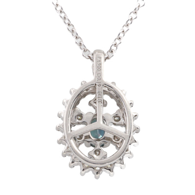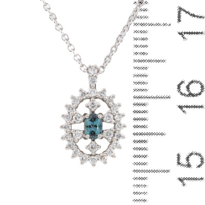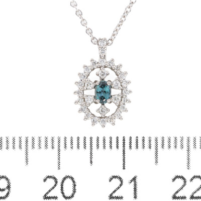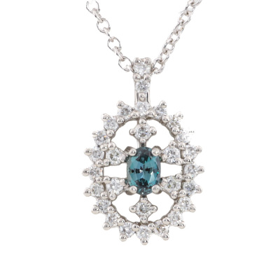 Alexandrite and Diamond pendant with oval shape Natural Alexandrite of 0.13ct (moderate colour change from bluish green to purple) and round Natural Diamonds totalling 0.19ct. Platinum - 900 with 40.5cm 18ct white gold chain. Weight: 2.6g. (Pre-owned)