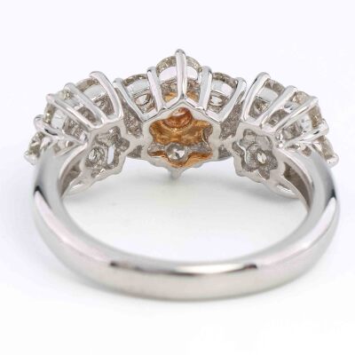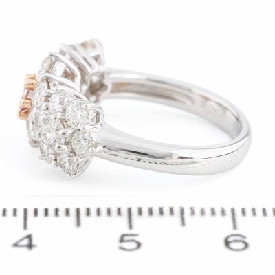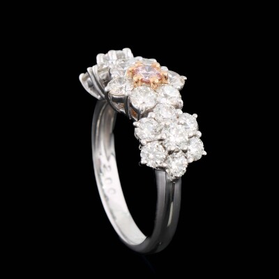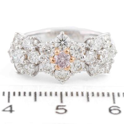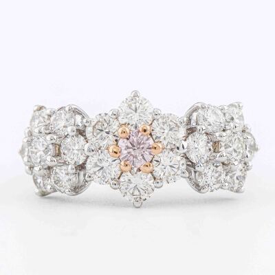 Flora design ring with a centre round Argyle Origin Natural pink Diamond of 0.13ct (With GSL Report graded as Natural Fancy Light Pink P1 #AA71266/8. Origin: Argyle Deposit, Western Australia) and round Natural white Diamonds totalling 2.00ct (Estimated grading: HIJ VS). Platinum - 900 with 18ct rose gold. Ring size L. Band width: 2.9mm. Weight: 8.3g. (Pre-owned)