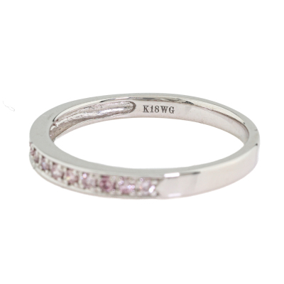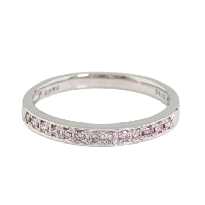 Diamond eternity ring with 13 round Natural Pink Diamonds totalling 0.13ct (Estimated grading: Natural Fancy Light Pink - Intense Pink SI). 18ct white gold. Ring size K. Band width: 2.1mm-2.2mm. Weight: 1.8g. (Pre-owned)