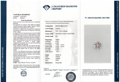 A loose round Argyle Origin Natural Pink Diamond of 0.15ct (With GSL Report graded as Natural Fancy Light Pink SI2 # AA71325/4. Origin: Argyle Deposit, Western Australia). (As New)