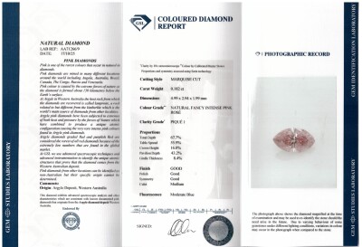 Loose marquise cut Argyle Origin Natural Pink Diamond of 0.18ct (With GSL Report graded as Natural Fancy Intense Pink Rose P1 #AA71266/9. Origin: Argyle Deposit, Western Australia). (As New)