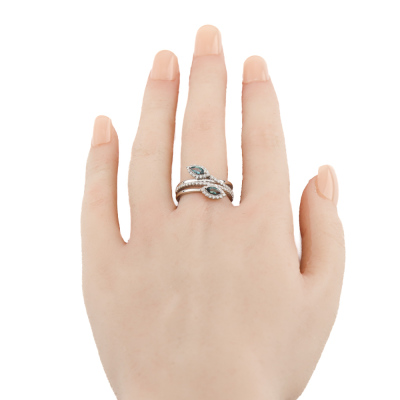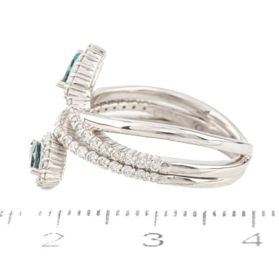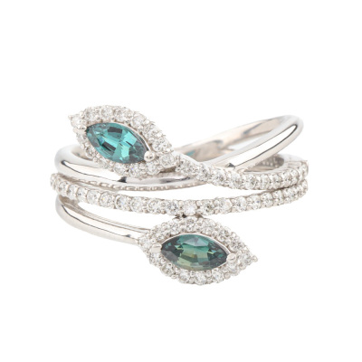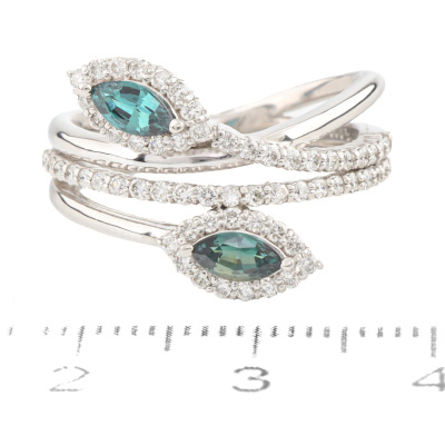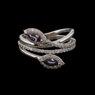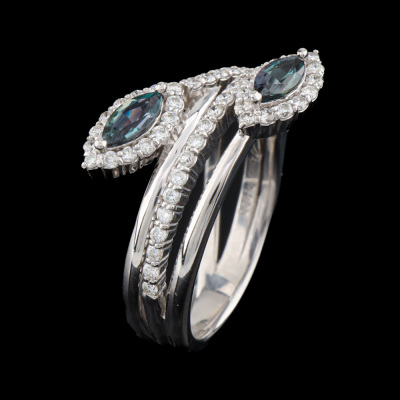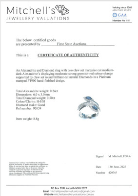 Alexandrite and Diamond ring with marquise shape Natural Alexandrite's totalling 0.24ct (colour change from greenish red) and round Natural Diamonds totalling 0.50ct (Estimated grading: H-I SI). Platinum - 900. Ring size M½. Band width: 5.1mm - 2.8mm. Weight: 8.8g. With Certificate #420745. (pre-owned)