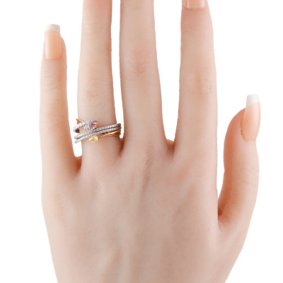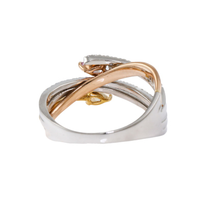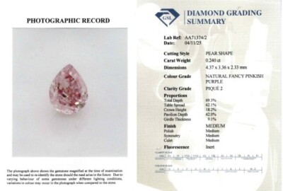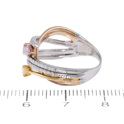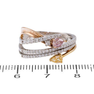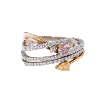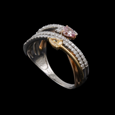 Diamond dress ring with a pear shape Natural purple Diamond of 0.24ct (GSL Report graded as Natural Fancy Pinkish Purple P2 # AA71374/2), pear shape Natural Yellow Diamond of 0.15ct (Estimated grading: Natural Fancy Yellow VS-SI) and round Natural White Diamonds totalling 0.32ct (Estimated grading: H-I SI). Platinum - 950, 18ct yellow & rose gold. Ring size M1/2. Band width: 2mm - 4mm. Weight: 5.6g.