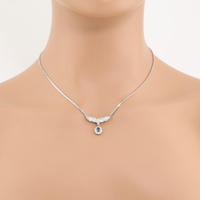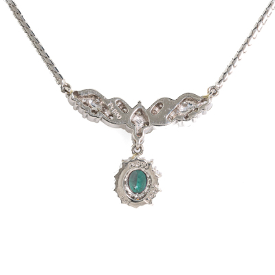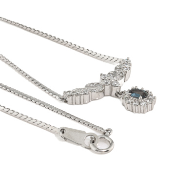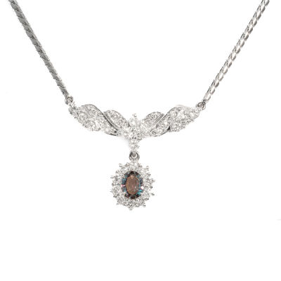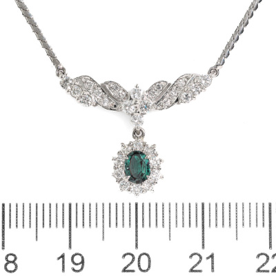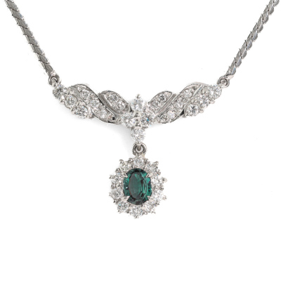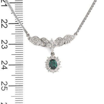 Alexandrite and Diamond necklace with centre oval shape Natural Alexandrite totalling 0.27ct (strong to moderate colour change from Bluish Green to Purple) and round Natural Diamonds totalling 0.57ct (Estimated grading: G-H VS). Platinum - 900 with Platinum - 850 attached chain. Length: 43cm. Weight: 12.6g. (Pre-owned)
