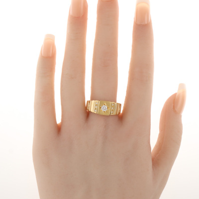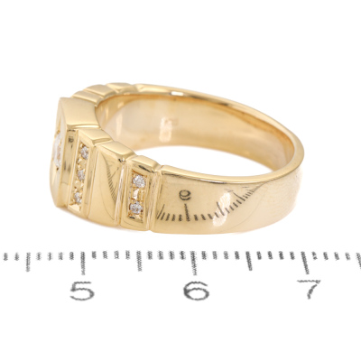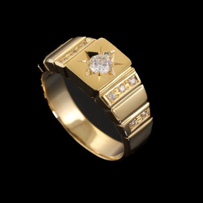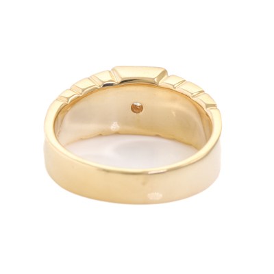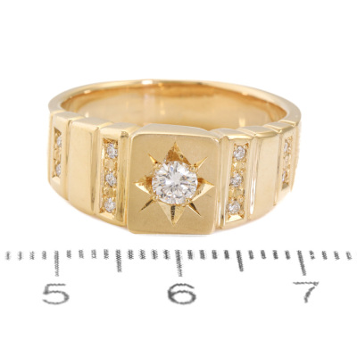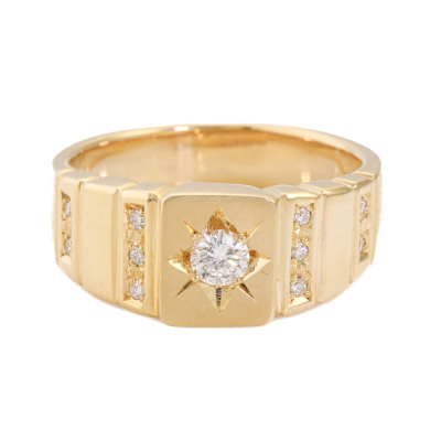 Mens ring with round Natural Diamond of 0.27ct. 18ct yellow gold. Ring size: R. Band width: 4.7mm - 6.5mm. Weight: 13.8g (Pre-owned)