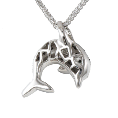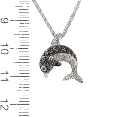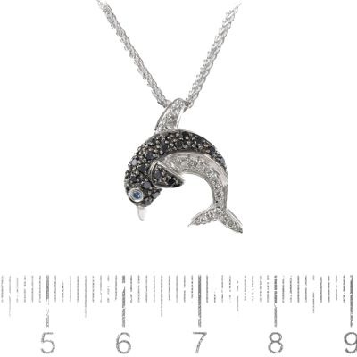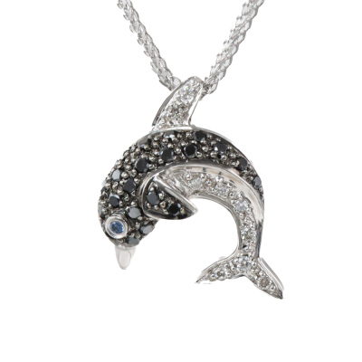 Dolphin design pendant with round Natural black & white Diamonds totalling 0.30ct and a round Natural blue Sapphire eye of 0.01ct. 18ct white gold with black rhodium plating and 45cm 18ct white gold chain. Weight: 5.8g. (Pre-owned)