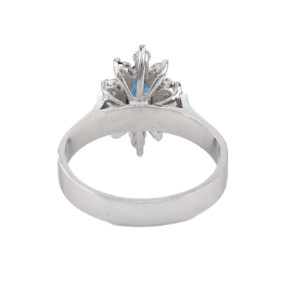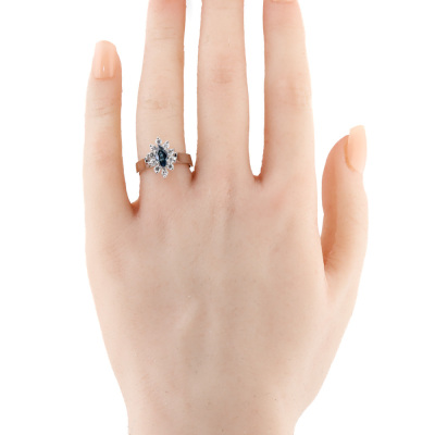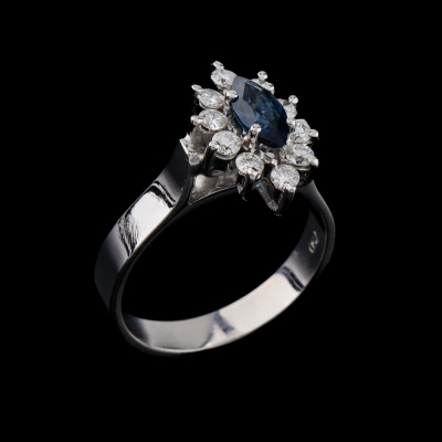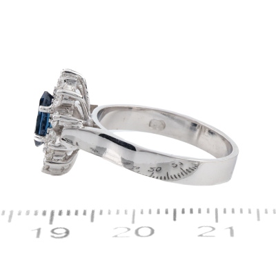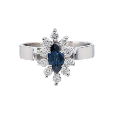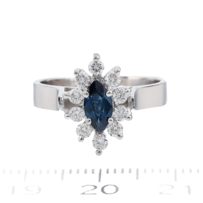 Sapphire and Diamond ring with marquise cut Natural Blue Sapphire of approximately 0.30ct and round Natural Diamonds totalling approximately 0.30ct (Estimated grading: G-H SI). 18ct white gold. Ring size: N. Band width: 3.4mm. Weight: 4.9g (As New)