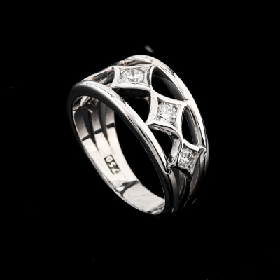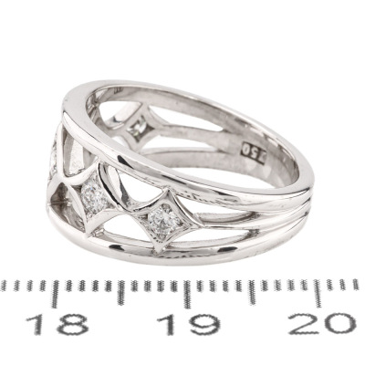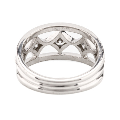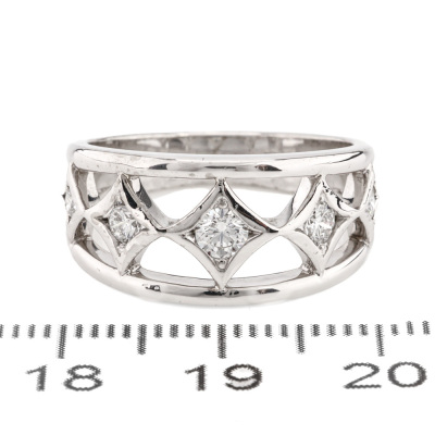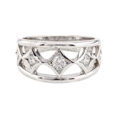 Diamond dress ring with 5 round natural Diamonds totalling approximately 0.35ct (Estimated grading: G-H VS). 18ct white gold. Ring size: N - Ring resizing is not recommended. Band width: 3.8mm - 4.5mm. Weight: 7.1g. (pre-owed)
