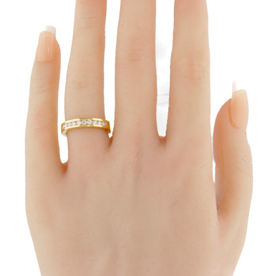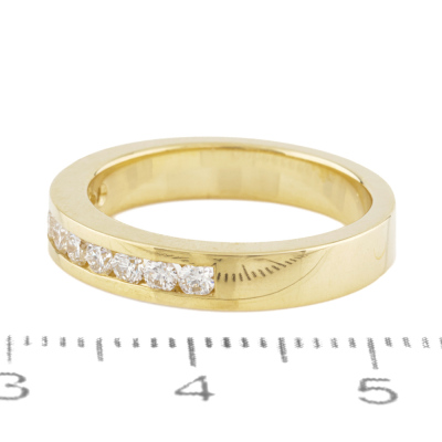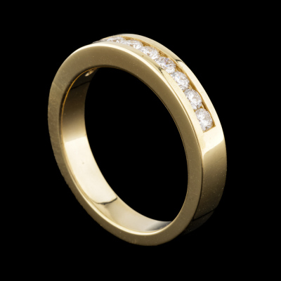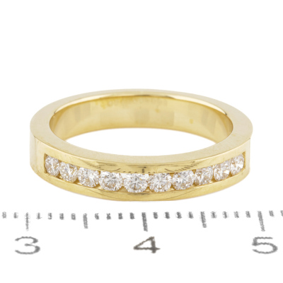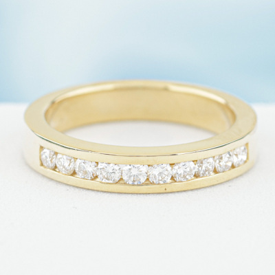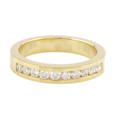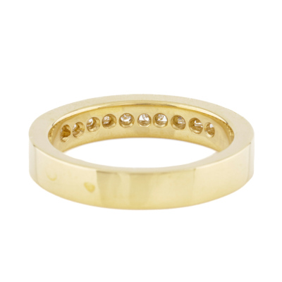 Diamond ring band with 10 round Natural Diamonds totalling approximately 0.30ct (Estimated grading: H SI). 18ct yellow gold. Ring size K. Band width: 3.5mm-3.6mm. Weight: 5.3g. (Pre-owned)