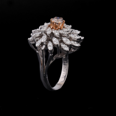 Diamond ring with centre round Natural Diamond of 0.31ct (With GSL Diamond Report graded as Natural Fancy Deep Pinkish Brown SI1 #AA70946/2) and round Natural Diamonds totalling 1.00ct (Estimated grading: G-H SI). Platinum - 900 with rose gold plated claws. Ring size J. Band width: 2.5mm. Weight: 11.3g. (Pre-owned)