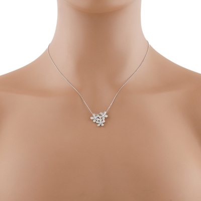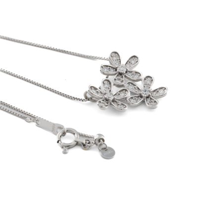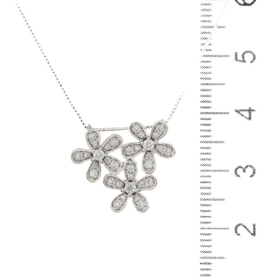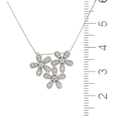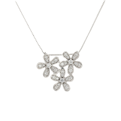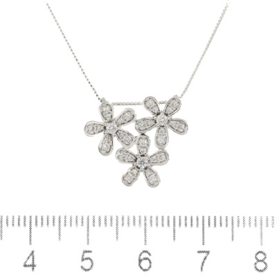 Diamond flower pendant with round Natural Diamonds totalling 0.32ct (Estimated grading: H SI). 18ct white gold and 18ct white gold 44.5cm chain. Weight: 3.4g. (pre-owned)
