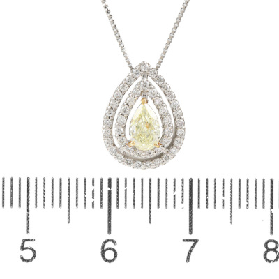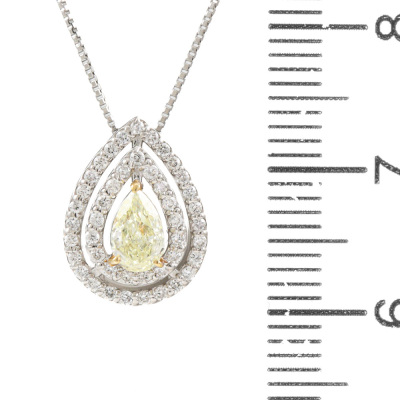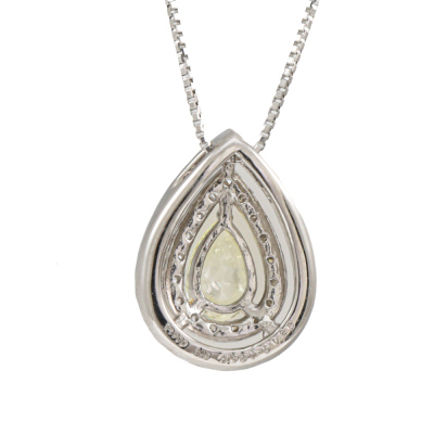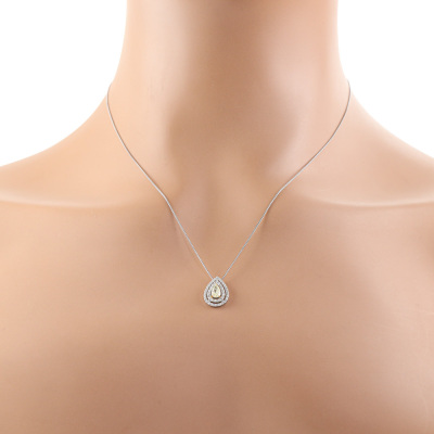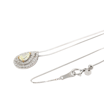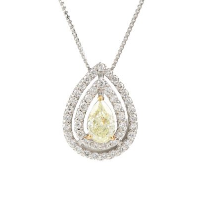 Diamond double halo pendant with centre pear shape Natural Diamond of 0.33ct (Estimated grading: Natural Light Yellow VS) and round Natural white Diamonds totalling 0.25ct. Platinum - 900 and yellow gold plated claws pendant with 45cm Platinum - 850 adjustable chain. Weight: 3.3g. (Pre-owned)