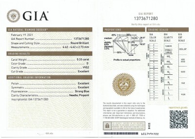 A loose round brilliant cut Natural Diamond of 0.33ct (With GIA Dossier Report graded as D VVS2 #1373671280). (New)