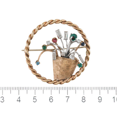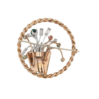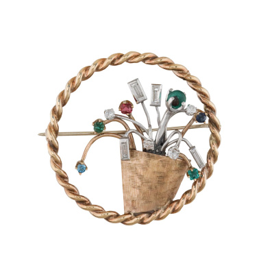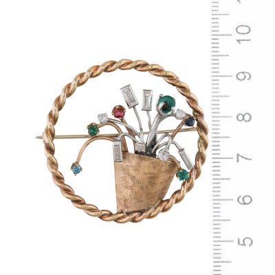Diamond flower pot designed brooch with baguette cut & round Natural Diamonds totalling approximately 0.35ct (Estimated grading: H-I P1) and a round Natural Red Spinel of approximately 0.08ct and rest gripoix glass stones. Diameter of brooch: 4cm. 9ct yellow and white gold. Weight: 11.3g. (Pre-owned)