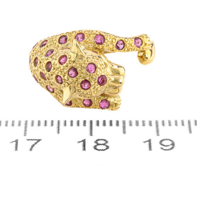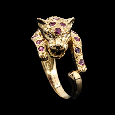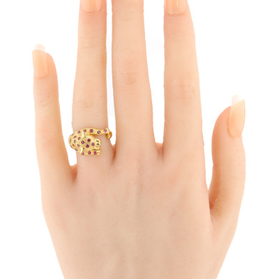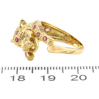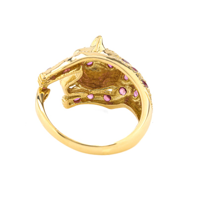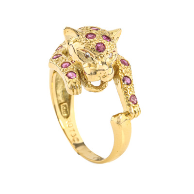 Ruby and Diamond ring with round Natural Rubies totalling approximately 0.37ct and 2 round Natural Diamonds totalling 0.01ct. 18ct yellow gold. Ring size K. Band width: 2.1mm - 3.8mm. Weight: 5.8g. (Pre-owned)