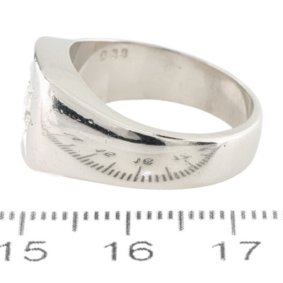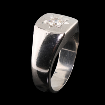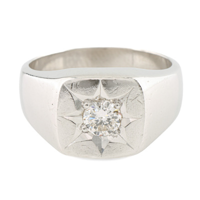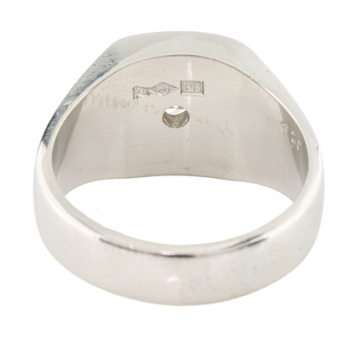 Mens ring with centre round Natural Diamond of 0.38ct (Estimated grading: J SI). Platinum - 850. Ring size P1/2. Band width: 5.1mm - 6.7mm. Weight: 18.5g. (Pre-owned)