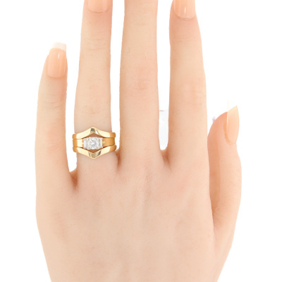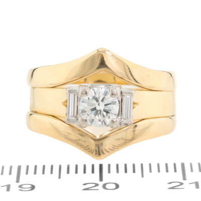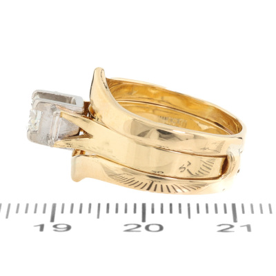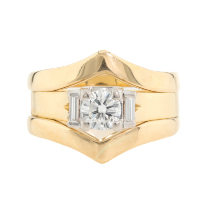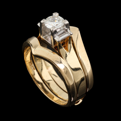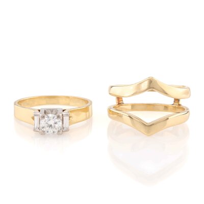 Diamond ring set. 1) Diamond solitaire ring with a round Natural Diamond of 0.40ct (Estimated grading: H-I VS). 18ct yellow and white gold. 2) Matching fitted ring band. 18ct yellow gold. Both ring size: L1/4. Total band width: 6.5mm. Total weight: 9.3g. (Pre-owned)