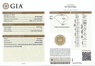 A loose pear shape natural Diamond of 0.40ct (with GIA Diamond Dossier report graded as D Internally Flawless #3515531886). (New)