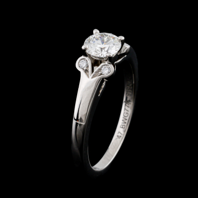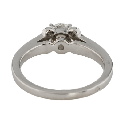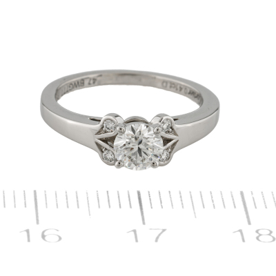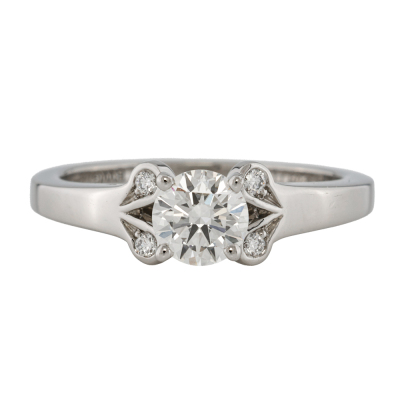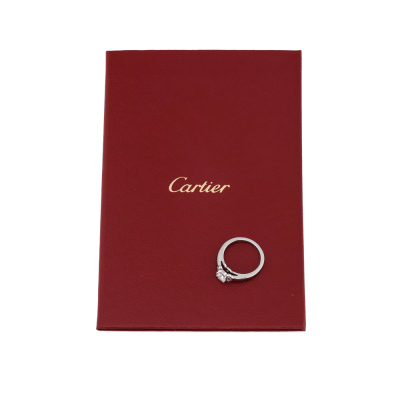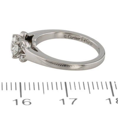 Cartier Diamond solitaire ring with round brilliant cut Natural Diamond of 0.41ct, set with 4 small round brilliant cut diamonds totalling 0.04ct. Platinum - 950. Cartier stamped size 47, measured as Australian size; G3/4. Weight: 4.2g. With Cartier Certificate dated 28/11/2020.