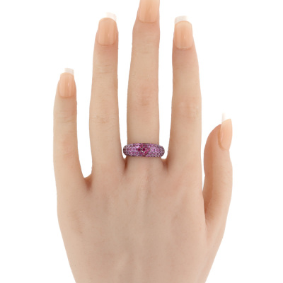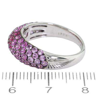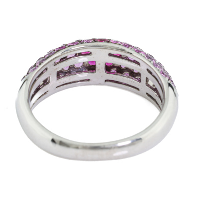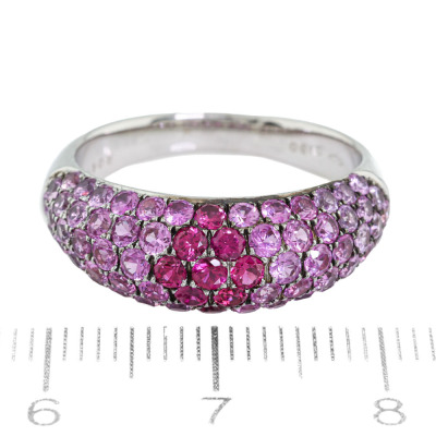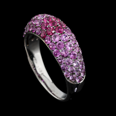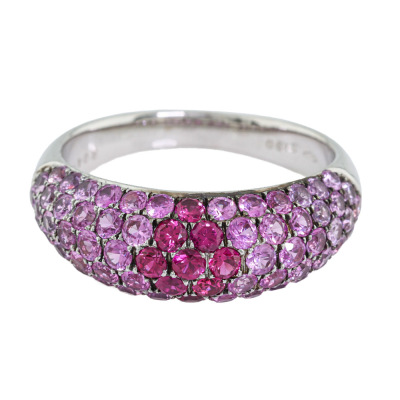 Ruby and Sapphire ring with round Natural Rubies totalling 0.41ct and round Natural Pink Sapphires totalling 1.90ct. 18ct white gold. Ring size N 1/2. Band width: 2.7mm - 5.5mm. Weight: 5.0g.