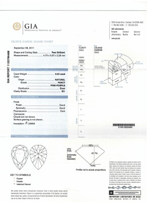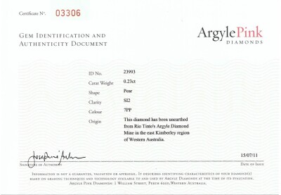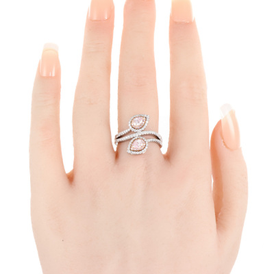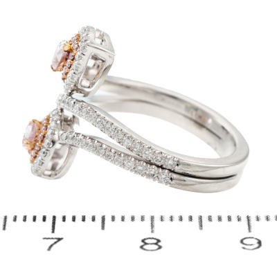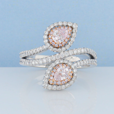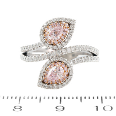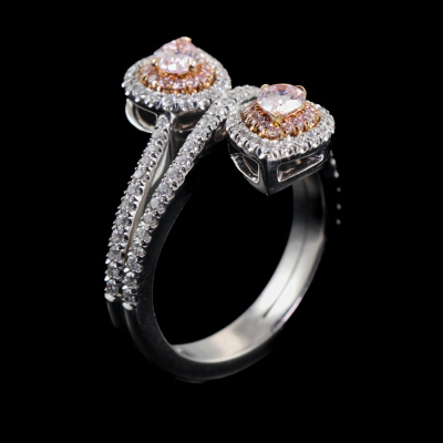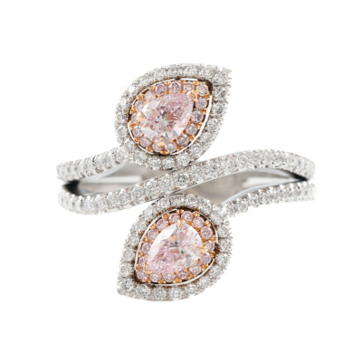 Diamond ring with 2 pear shape Argyle Pink Diamonds totalling 0.43ct (Argyle Pink Diamonds Certificate graded as 7PP VVS1 #58973 & 7PP VVS2 #23993. GIA Report graded as Natural Fancy Light Pinkish Purple Even VVS2 #1132796492 & Natural Fancy Pink-Purple Even SI1 #1132796488) and round pink & white Diamonds totalling approximately 0.62ct (Estimated grading: Fancy Purplish Pink SI). 18ct rose gold & Platinum - 950. Ring size L. Band width: 3.5mm. Weight: 9.2g. (Pre-owned)