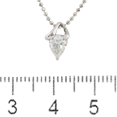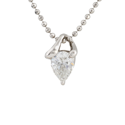 Diamond solitaire pendant with pear shape natural Diamond of approximately 0.32ct (Estimated grading: G SI). Platinum - 900 with Platinum - 850 40cm adjustable chain. Weight: 3.1g. (pre-owned)