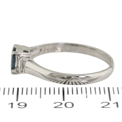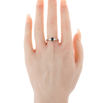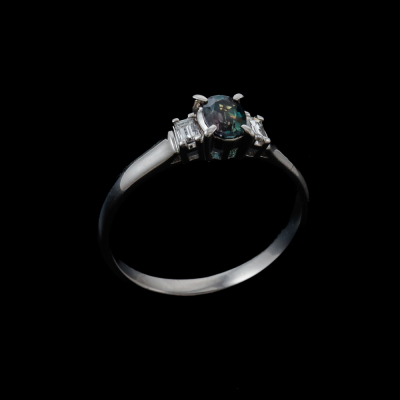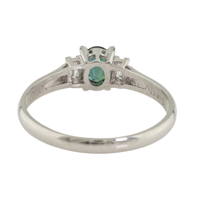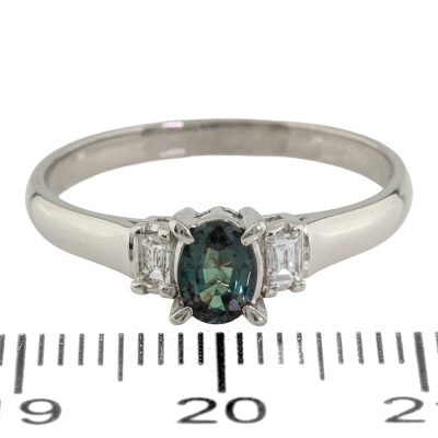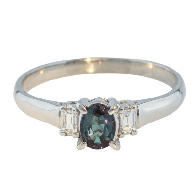 Alexandrite and Diamond ring with centre oval shape Natural Alexandrite of 0.45ct (Moderate colour change from Bluish Green to Purple) and 2 shoulder baguette cut Natural Diamonds totalling 0.15ct. Platinum - 900. Ring size Q. Band width: 2.1mm - 2.5mm. Weight: 3.5g. (Pre-owned)