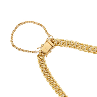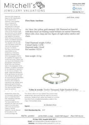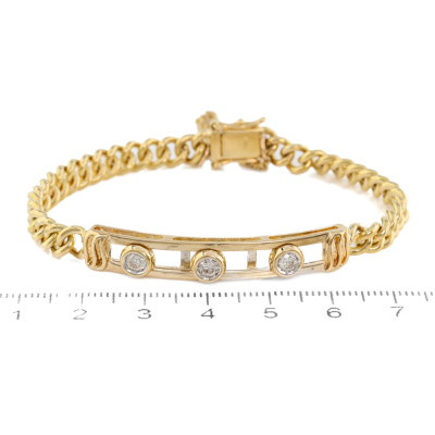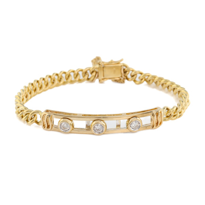 Diamond bracelet with three motion round Natural Diamonds totalling approximately 0.45ct (Estimated grading: I-J SI). 18ct yellow gold with safety chain. Inner circumference: approximately 17cm. Weight: 22.2g. With Valuation Certificate #420660. (Pre-owned)