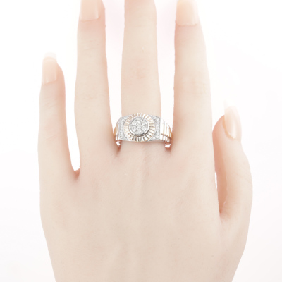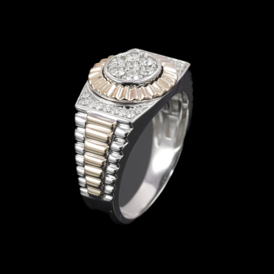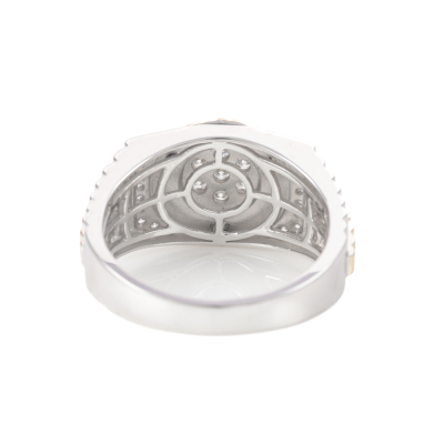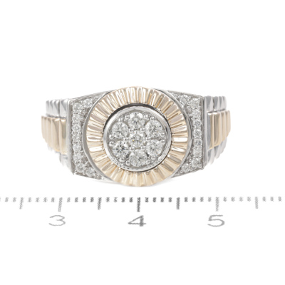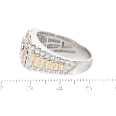 Diamond mens ring with 25 round Natural Diamonds totalling 0.46ct (Estimated grading: I-J VS). 9ct white and yellow gold. Ring size: U1/4. Band width: 3.5mm-5.9mm. Weight: 8.6g (New)