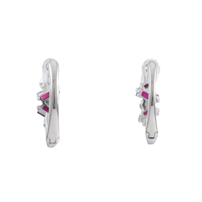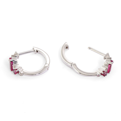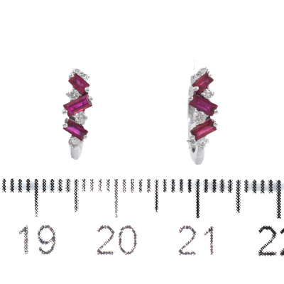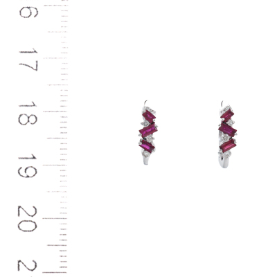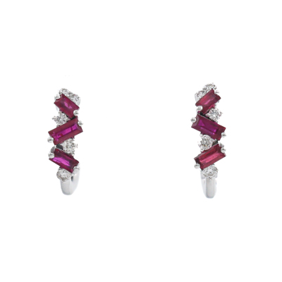 Ruby and Diamond huggie earrings with baguette cut Natural Rubies totalling 0.46ct and round Natural Diamonds totalling 0.11ct. 18ct white gold. Weight: 2.4g (New)