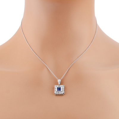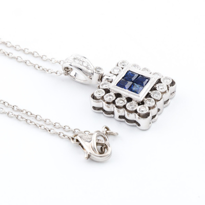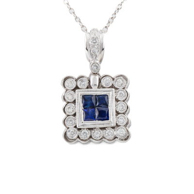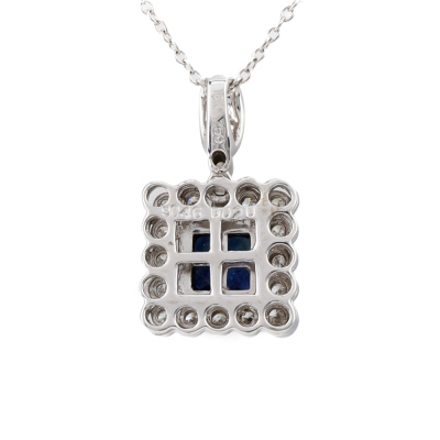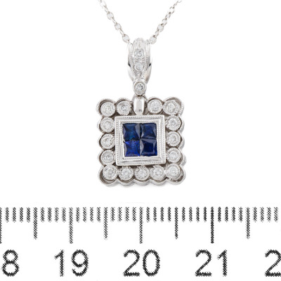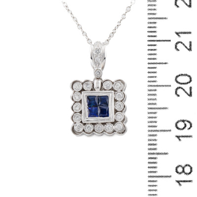 Sapphire and Diamond pendant with princess cut Blue Natural Sapphires totalling 0.46ct and round Natural Diamonds totalling 0.20ct. 18ct white gold with 40cm 18ct white gold adjustable chain. Weight: 5.4g.