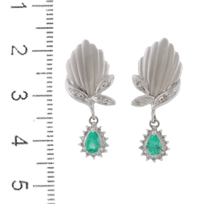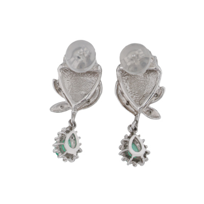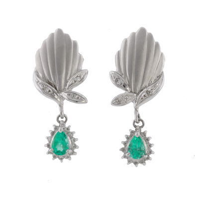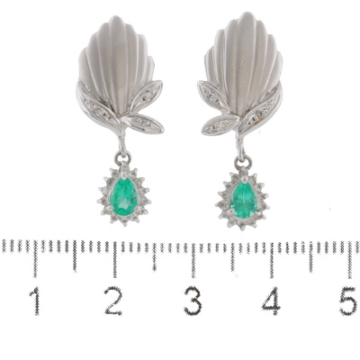 Emerald and Diamond earrings with pear shape Natural Emeralds totalling 0.47ct and round Natural Diamonds totalling 0.24ct. Platinum - 900 with 14ct white gold & silicon backs. Drop length: 2.8cm. Weight: 6.0g. (pre-owned)