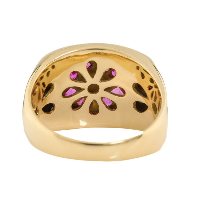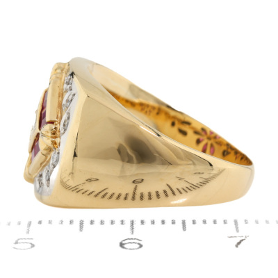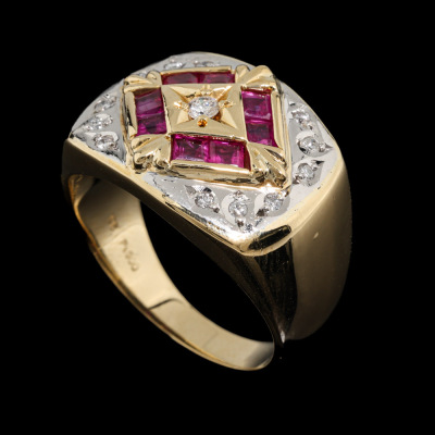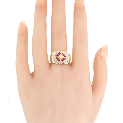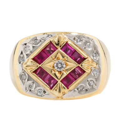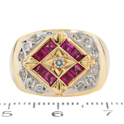 Ruby and Diamond ring with carre cut Natural Rubies totalling approximately 0.48ct and round Natural Diamonds totalling 0.13ct. 18ct yellow gold and Platinum - 900. Ring size P 3/4. Band width: 3.1mm - 6.1mm. Weight: 12.2g. (Pre-owned)