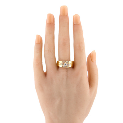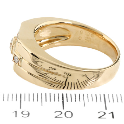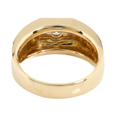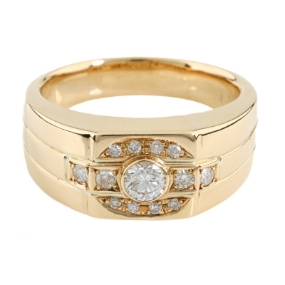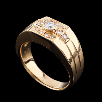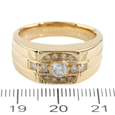 Mens ring with round Natural Diamonds totalling 0.49ct (Estimated grading: GHI VS-SI). 18ct yellow gold. Ring size T3/4. Band width: 4.4mm-8.0mm. Weight: 15.8g. With Valuation Certificate #421419. (Pre-owned)