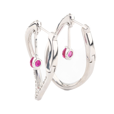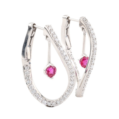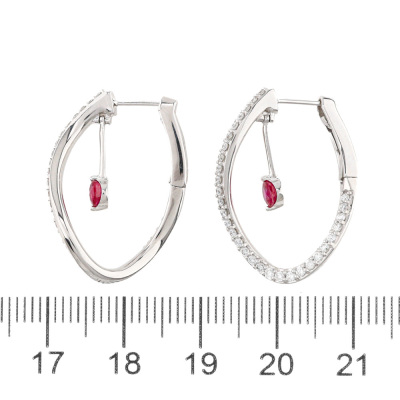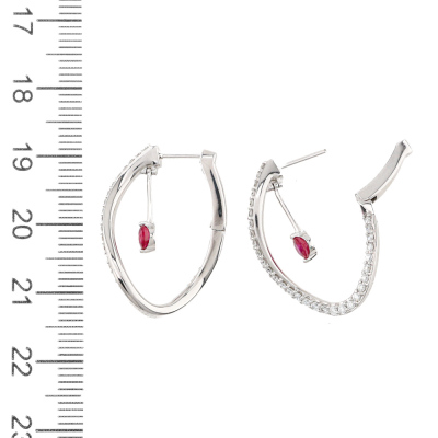 Oval shape twist hoop earrings with two round Natural Rubies totalling 0.49ct and round Natural Diamonds totalling 0.66ct (Estimated grading: G-H SI). 18ct white gold. Drop length: 2.5cm. Weight: 6.4g. (Pre-owned)