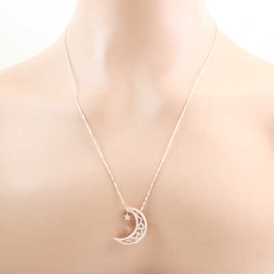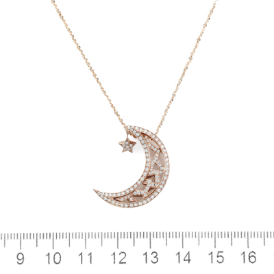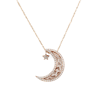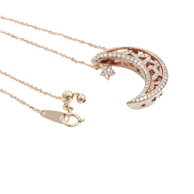 Moon & star design pendant with round Natural Diamonds totalling 0.50ct (Estimated grading: I-J SI). 18ct rose gold with 60.5cm 18ct rose gold adjustable chain. Weight: 7.6g. (Pre-owned)