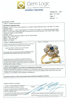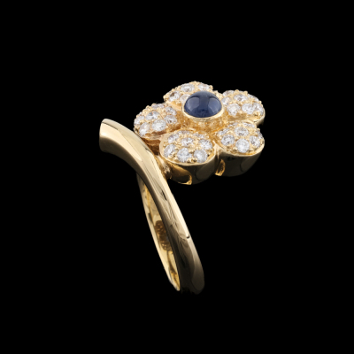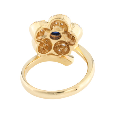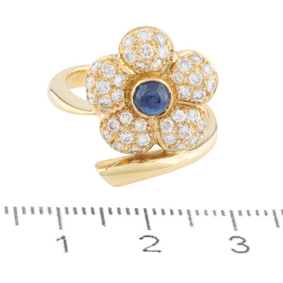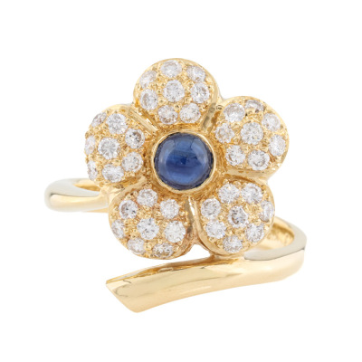 Sapphire and Diamond flower design ring with a centre round cabochon cut Natural blue Sapphire of 0.51ct and round Natural Diamonds totalling 0.73ct (Estimated grading: G-I SI-PI). 18ct yellow gold. Ring size N3/4. Band width: 2.9mm - 1.9mm. Weight: 8.4g. With Jewellery Appraisal dated 07/11/25. (Pre-owned)