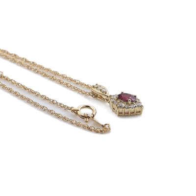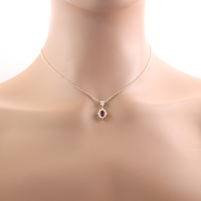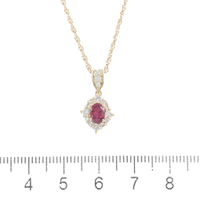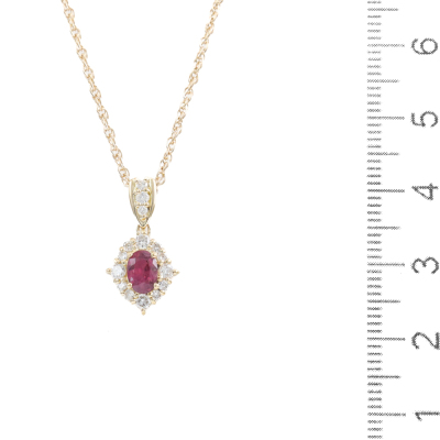 Ruby and Diamond pendant with oval shape Natural Ruby of 0.53ct and round Natural Diamonds totalling 0.32ct (Estimated grading: HIJ SI). 18ct yellow gold and 18ct yellow gold 40cm adjustable chain. Weight: 4.5g. (Pre-owned)