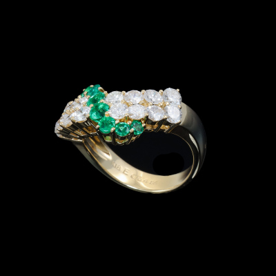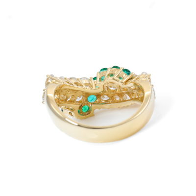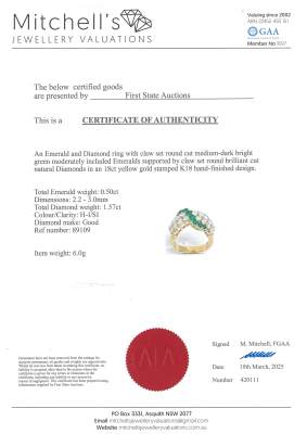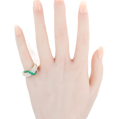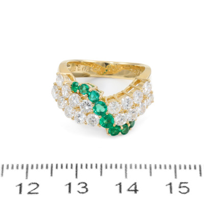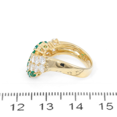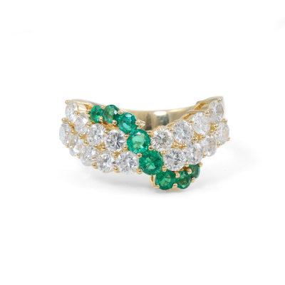 Emerald and Diamond ring with round Natural Emerald totalling 0.54ct and round Natural Diamonds totalling 1.57ct (Estimated grading: H-I SI). 18ct yellow gold. Ring size K. Band width: 3.6mm - 4.4mm. Weight: 6g. With Certificate #420111. (Pre-owned)