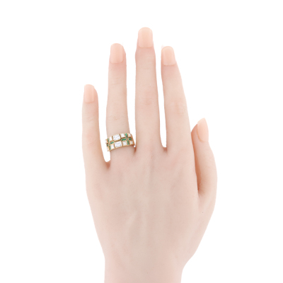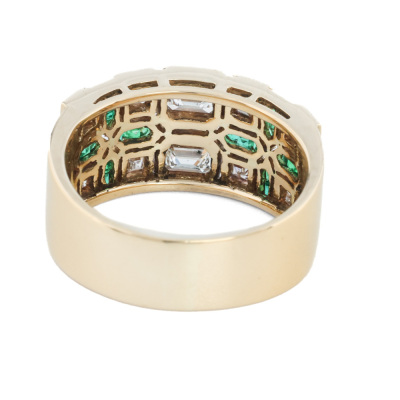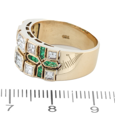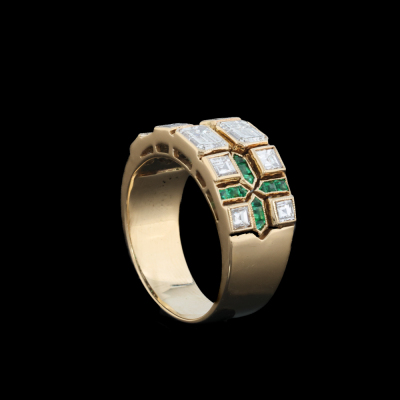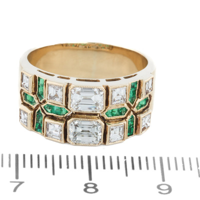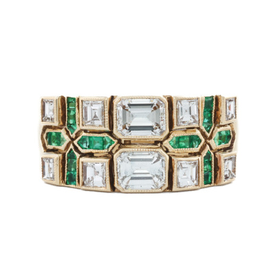 Emerald and Diamond ring with epaulette cut & carre cut Natural Emeralds totalling 0.54ct and emerald & care cut Natural Diamonds totalling 1.45ct (Estimated grading: G VS). 18ct yellow gold. Ring size L. Band width: 5.8mm - 7.5mm. Weight: 7.1g. (Pre-owned)