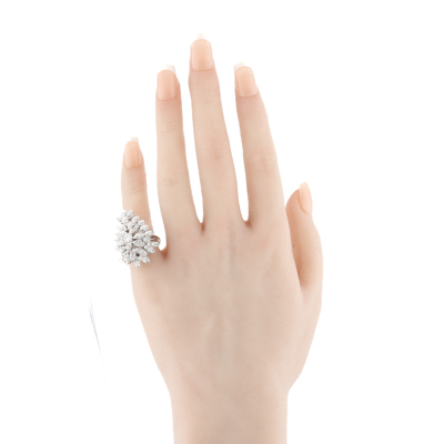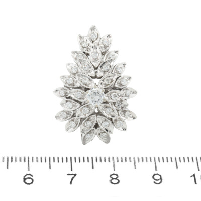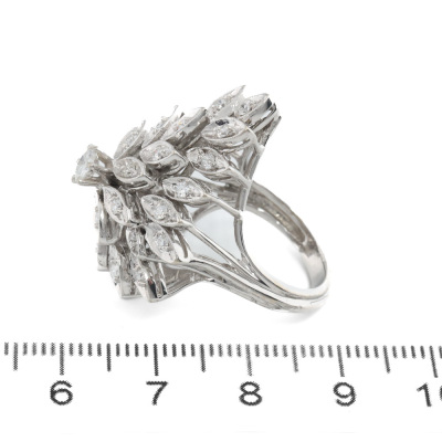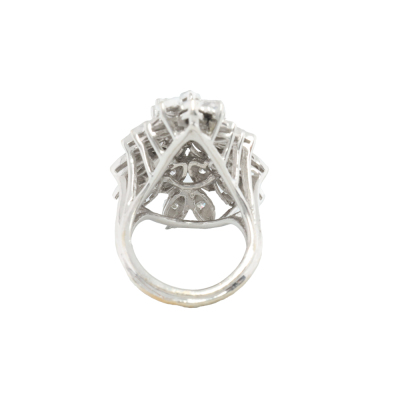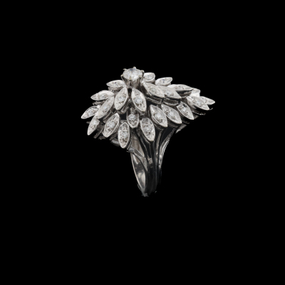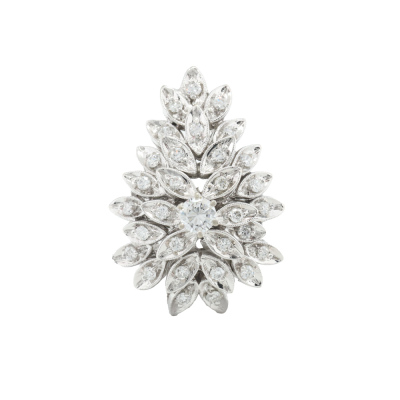 Diamond leaf designed dress ring with round a top centre round Natural Diamond of approximately 0.25ct and surrounding round Natural Diamonds totalling 0.30ct (Estimated grading: H-I VS-SI). 14ct white gold. Ring size G1/2. Band width: 2.9mm-5.4mm. Weight: 10.8g. (Pre-owned)