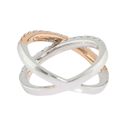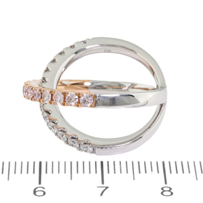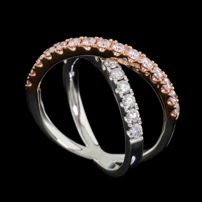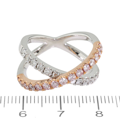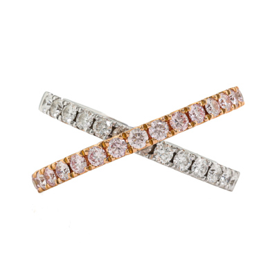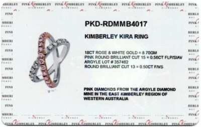 Kimberley Kira Pink Diamond ring with 15 round Argyle Natural Pink Diamonds totalling 0.56ct (with Pink Kimberley Diamonds Certificate of Authenticity graded as Fancy Light Pink SI #PKD-RDMMB4017, Argyle Lot #357462) and 13 round Natural White Diamonds totalling 0.50ct (Graded as: F VS). 18ct rose & white gold. Ring size N - Resizing is not recommended. Minimum band width: 3.0mm. Weight: 8.5g.