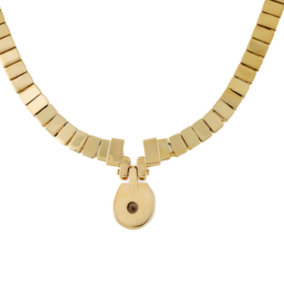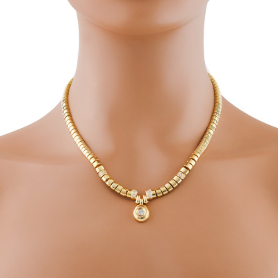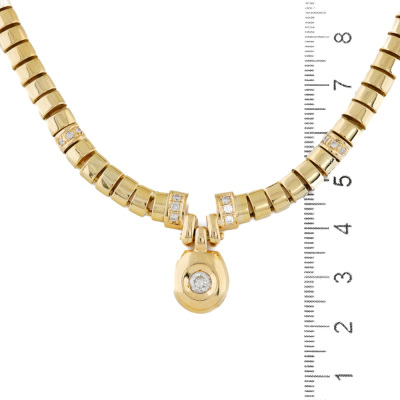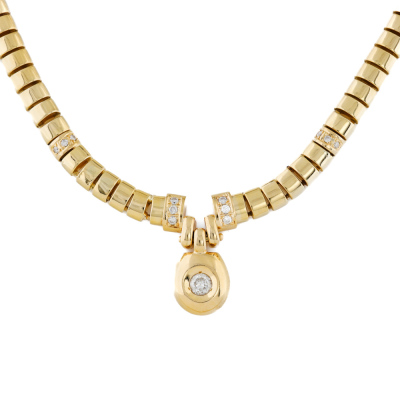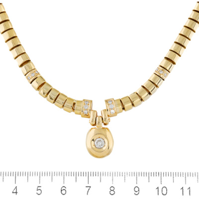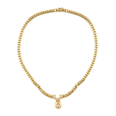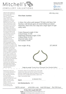 Diamond necklace with centre round Natural Diamond of 0.36ct (Estimated grading: H-I SI) and rest round Natural Diamonds totalling 0.20ct. 18ct yellow gold. Length: 44cm. Weight: 48.4g. With Valuation Certificate #421040. (Pre-owned)