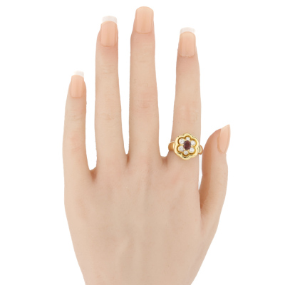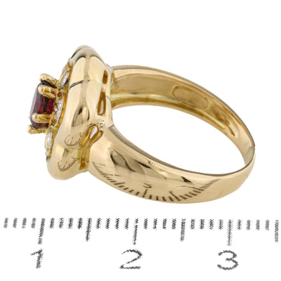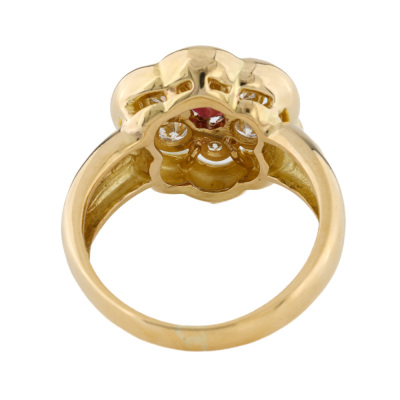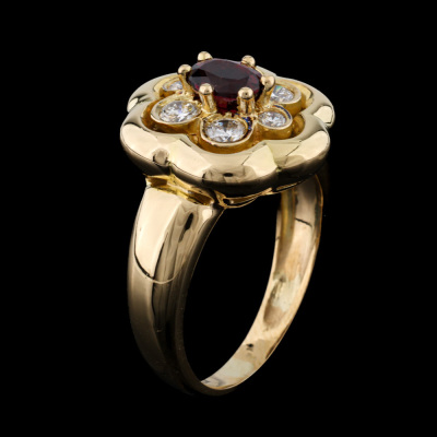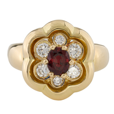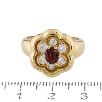 Floral design ring with a centre oval shape Natural Ruby of approximately 0.56ct and round Natural Diamonds totalling approximately 0.40ct (Estimated grading: G VS-SI). 18ct yellow gold (XRF tested, no stamp). Ring size M. Band width: 2.9mm - 6.1mm. Weight: 7.9g.